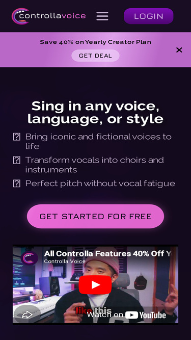 76%Controlla Voice is an AI singing voice generator that brings iconic and fictional voices to life, transforms vocals into choirs and instruments, and perfects pitch without vocal fatigue.
