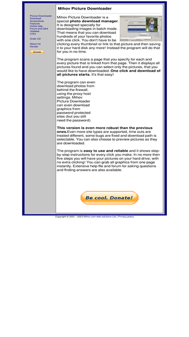 100%mihov picture downloader is a handy and useful tool for batch downloading of all the pictures from one page. just type in the address and let this program do the rest. one click and all the graphics will be transfered to your hard drive, without clicking and viewing on every thumbnail and link. the best download manager that is designed to get all the pictures just from a link.