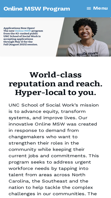 76%Our innovative new Online MSW was created in response to demand from changemakers who want to strengthen their roles in the community while keeping their current jobs and commitments. This program seeks to address urgent workforce needs by tapping into talent from underserved areas across North Carolina, the Southeast and the nation to help tackle the complex challenges in our communities.