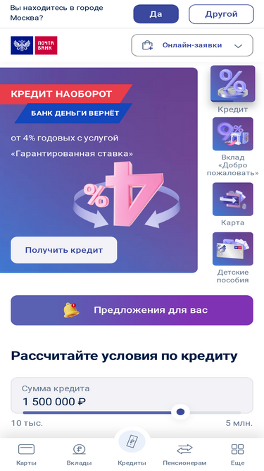 72%Все виды банковских продуктов: вклады, дебетовые карты с кешбэком, инвестиции, онлайн-банкинг. Широкий спектр банковских продуктов, зарплатное обслуживание. Быстрое и удобное оформление в Почта Банке 🟦🟥 Выгодные условия