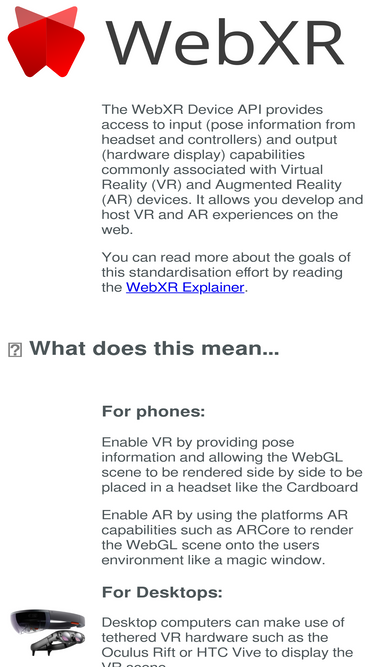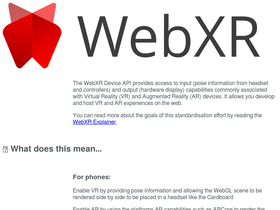 74%Get started building XR applications through the Web with the WebXR Device API, demos, docs, samples and more.