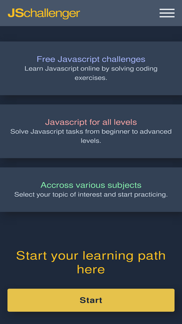 95%Free Javascript challenges. Learn Javascript online by solving coding exercises. Javascript for all levels. Solve Javascript tasks from beginner to advanced levels.