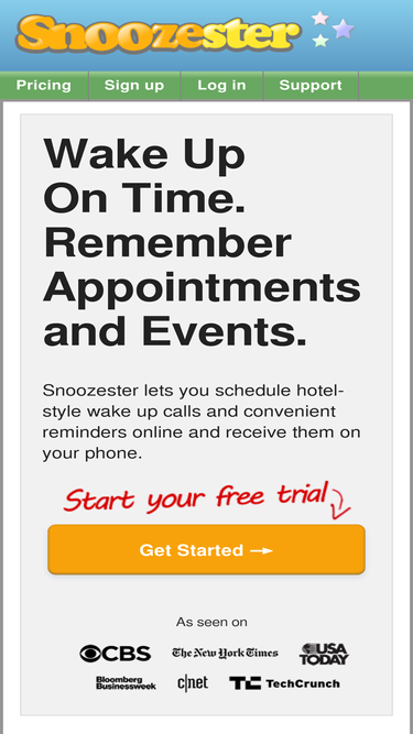 32%Snoozester provides hotel-style wake up calls and convenient reminders. Schedule wake up calls and reminders online and receive them on your phone. Sign up for a Free Account.