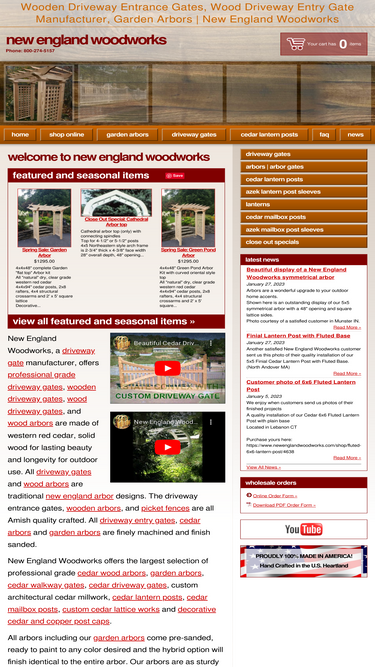 89%Discover timeless outdoor accents from New England Woodworks — specializing in handcrafted Western Red Cedar driveway gates, arbors, lantern posts, and mailbox kits. Built for beauty, durability, and heritage.