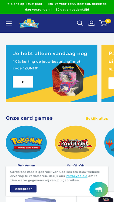 Op zoek naar Pokémon kaarten of andere TCG’s? Cardstore.nl heeft een ruim aanbod van originele Pokémon, Yu-Gi-Oh!, One Piece en MTG kaarten. Bestel boosters, boxen, tins en singles. Voor fanatieke spelers en verzamelaars – altijd snel en betrouwbaar geleverd.