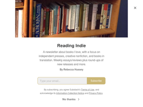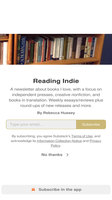 A newsletter about books I love, with a focus on independent presses, creative nonfiction, and books in translation. Weekly essays/reviews plus round-ups of new releases and more. Click to read Reading Indie, by Rebecca Hussey, a Substack publication.