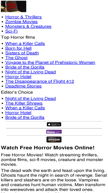 87%watch horror movies free. watch classic horror thriller films and tv shows online. free legal streams of scary old slasher movies, zombie movies, creature features and sci-fi movies.