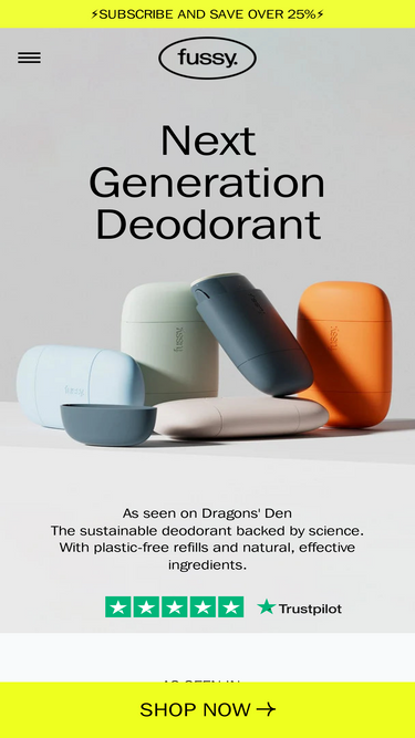 As seen on Dragons' Den. Fussy is the UK's highest rated refillable natural deodorant with plastic-free refills and clean effective ingredients that actually work. Backed by science it will keep you smelling fresh for over 24 hours.