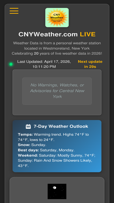 82%cnyweather.com - live weather for central new york. personal weather station with realtime updates, live radar, streaming webcams, climate data and more.