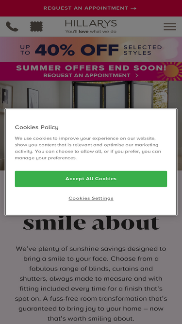 Save up to 40% on selected blinds & shutters, 20% off curtains, and 10% off awnings in the Hillarys Spring Sale. Shop now for incredible savings!