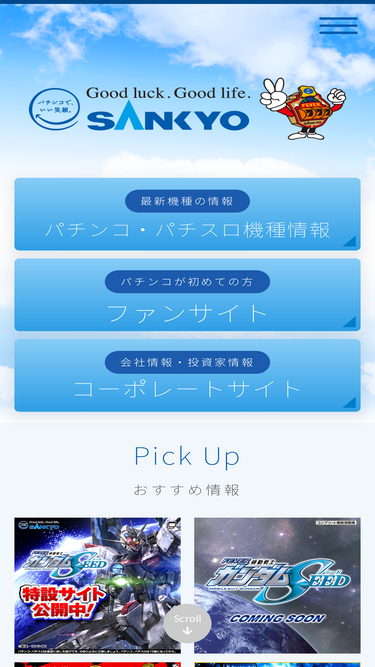 85%SANKYOオフィシャルのポータルサイトです。『パチンコ・パチスロ機種情報』『ファンサイト』『コーポレートサイト』をはじめ、各SANKYOオフィシャルサイトと連動しています。パチンコ・パチスロメーカーSANKYOの、最新機種やおすすめ情報をいち早くお届けします。