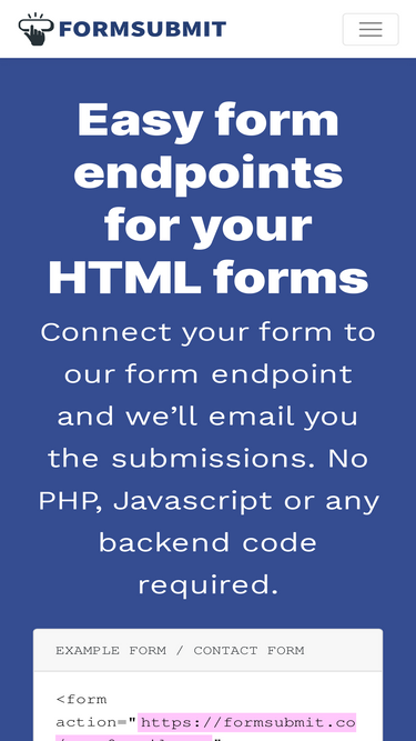 97%FormSubmit is a form backend, API and email service for HTML forms. It sends your site's form submission directly into your inbox without a need for any backend code or SMTP setup.