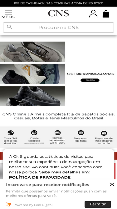 100%Sapatos Masculinos com Qualidade e Conforto é na CNS Online. Compre em Até 6x Sem Juros e Frete Grátis*. Ganhe 10% de Cashback para próxima compra. Entrega em 3h em SP.