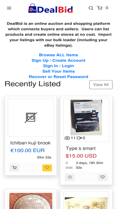 72%DealBid is an online auction and shopping platform which connects buyers and sellers. Users can create listings and online stores at no cost.