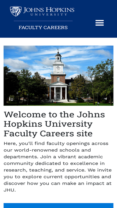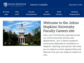 98%jhu faculty careers lists open faculty positions across the schools, institutes and centers of johns hopkins university. the list of jobs is updated daily. while most positions are located in the baltimore and dc vicinities, jobs are sometimes offered in other areas where jhu operates: across maryland, locations outside of maryland and the district of columbia and, at times, internationally.