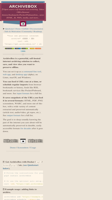 100%🗃 Open source self-hosted web archiving. Takes URLs/browser history/bookmarks/Pocket/Pinboard/etc., saves HTML, JS, PDFs, media, and more…