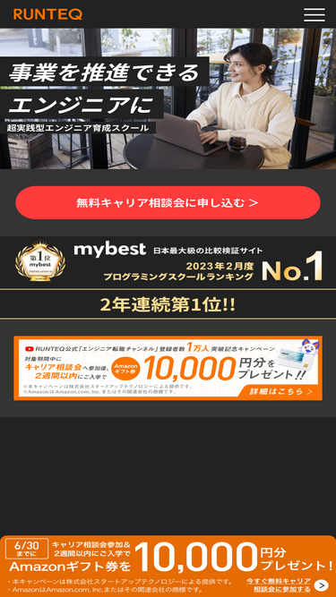 74%オンラインプログラミングスクールならRUNTEQ(ランテック)。業務未経験者が転職時に求められるプログラミングスキル、コミュニケーションスキル、チーム開発スキル、カルチャーフィットを総合的に学び、就職後に求められる事業を推進する力を身に付けることができます。
