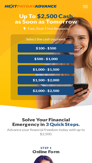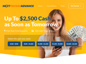 60%nextpaydayadvance is a fully online loan connecting service that allows you to access our large network of professional lenders who are dedicated to user satisfaction. there is no obligation to accept a loan offer. your loan can be deposited into your bank account as soon as the next business day.