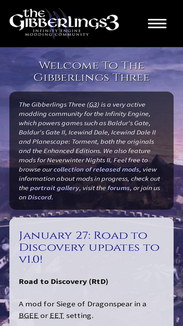 100%the gibberlings three (g3) is a very active modding community for the infinity engine, which powers games such as baldur's gate, baldur's gate ii, icewind dale, icewind dale ii and planescape: torment, both the originals and the enhanced editions. we also feature mods for neverwinter nights ii. feel free to browse our collection of released mods, view information about mods in progress, check out the portrait gallery, visit the forums, or join us on discord.