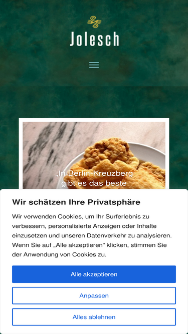 88%Impressum Restaurant JoleschJolesch Gaststätten GmbH Muskauerstraße 110997 Berlin – KreuzbergFon: +49 (0)30 612 35 81Fax: +49 (0)30 611 11 65E-Mail: mail@jolesch.de Gesellschaftsform: GmbHFirmensitz: Muskauer Strasse 1, 10997 BerlinGeschäftsführerin: Macksem Setrak Verantwortlich für den Inhalt dieser Webseite:Jolesch Gaststätten GmbH, Macksem SetrakRegistergericht: Amtsgericht CharlottenburgRegisternummer: HRB 267401 BUSt-Id: DE370148582 Die auf diesen Webseiten sowie in unseren Prospekten bereitgestellten Informationen […]
