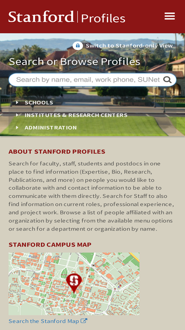 92%stanford profiles is the official site for faculty, postdocs, students and staff information (expertise, bio, research, publications, and more). the site facilitates research and collaboration in academic endeavors.