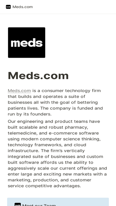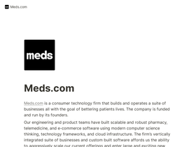 Meds.com is a consumer technology firm that builds and operates a suite of businesses all with the goal of bettering patients lives. The company is funded and run by its founders.