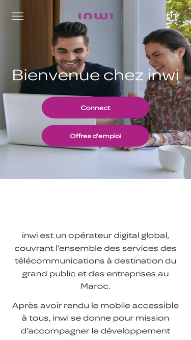 inwi est un opérateur digital global, couvrant l’ensemble des services des télécommunications à destination du grand public et des entreprises au Maroc. Après avoir rendu le mobile accessible à tou...