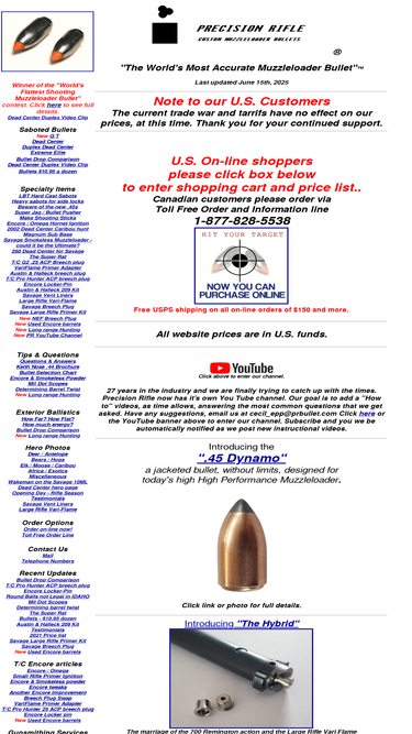 75%precision rifle - manufacturer of the world's most accurate muzzleloader bullets. includes qt, dead center, extreme elite, keith-nose saboted bullets. gonic sabots, breech plugs, vari-flame, super rat, big game air gun bullets, 9mm hunting air gun bullets, rifle primers for muzzleloaders, ballistol, patches, cleaner, nef, sidekick, encore, g2, 700 remington ml conversions, ruger ml conversions, ruger muzzleloader conversions, 98 mauser muzzleloader conversions, smokeless muzzleloaders, yhec bullets, 4h bullets, yhec sponsorship, t/c encore hinge pins, savage 10ml, savage smokeless improvements, duplex