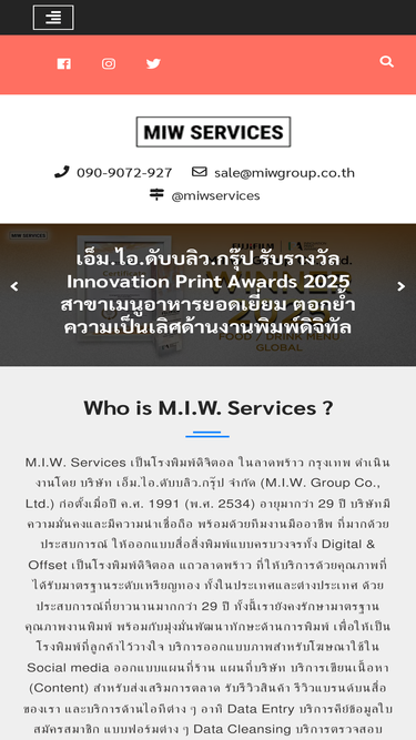 89%ที่อยู่บริษัท เอ็ม.ไอ.ดับบลิว.กรุ๊ป จำกัด (สำนักงานใหญ่) ตั้งอยู่ 1111/15,16 หมู่บ้านกลางเมือง แยกรัชดา-ลาดพร้าว ซอย 2 แขวงจันทรเกษม เขตจตุจักร กรุงเทพฯ 10900 เลขที่ประจำตัวผู้เสียภาษี: 0105534104898 โทรศัพท์ 029380950