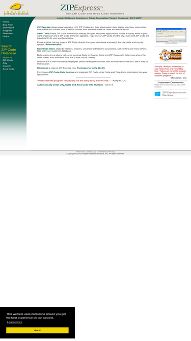92%zip express software: is a utility allowing easy look up of u.s. zip codes and their associated cities, states, counties, area codes, time zones and current time. search by zip code, city, county, state or area code. auto paste data in any format into applications or the clipboard via assignable hot keys. build your own pasting formats. copy entire ranges of zip code data to the clipboard or printer. for windows.