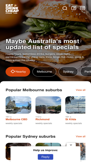 100%Find cheap eats, food, drink specials and trivia in restaurants pubs and bars around Melbourne.
