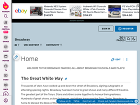84%welcome to the broadway fandom, all about broadway musicals and plays! thousands of stars have walked up and down the street of broadway, signing autographs or attending opening nights. broadway has been home to great shows and many different theatres. the greatest part of the tonys. stars and...