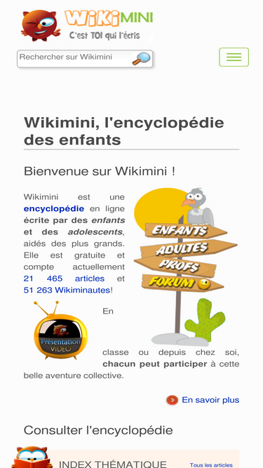 82%Encyclopédie pour enfants dont les définitions et articles sont écrits par des enfants et adolescents : A l’école ou à la maison, chacun peut y participer. Wikimini est un projet pédagogique d’écriture collaborative édité par des enseignants et spécialistes de l’éducation.