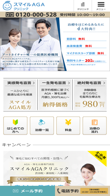 84%【業界最安値に挑戦】スマイルAGAクリニックは、東京(渋谷、新宿、八重洲)を中心にAGA・抜け毛・薄毛・若ハゲ・女性の薄毛治療を行っている専門病院です。【初診料・血液検査0円】【23時まで夜間診療】
