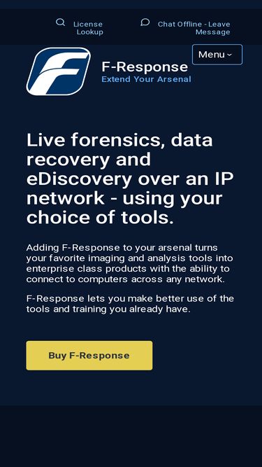 94%f-response is an easy to use, vendor neutral, patented software utility that enables an investigator to conduct live forensics, data recovery, and ediscovery over an ip network using their tool(s) of choice. f-response is not another analysis tool.