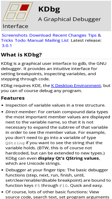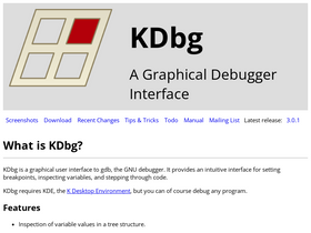 97%kdbg is a graphical user interface to gdb, the gnu debugger.it provides an intuitive interface for setting breakpoints,inspecting variables, and stepping through code.