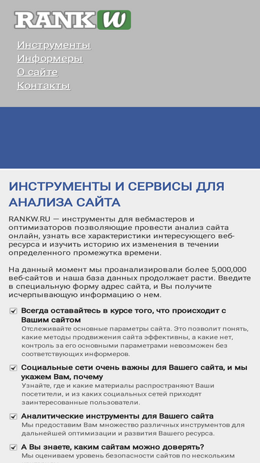 82%rankw.ru — бесплатный веб-сервис для анализа и сравнения показателей интересующего сайта с сайтами конкурентов. этот сервис будет полезен при настройке и оптимизации сайта для поисковых систем, позволит увеличить количество посетителей и доход.