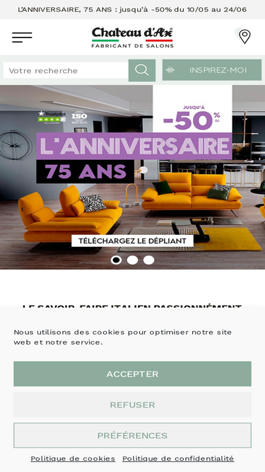 47%Chateau d'Ax, la marque référence, vous propose un large choix de salons, de fauteuils et de canapés en cuir ou en tissu microfibre, made in Italy.