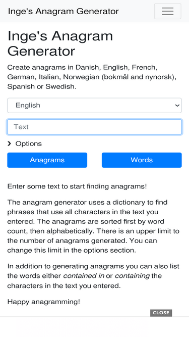 86%create anagrams in danish, english, french, german, italian, norwegian (bokmål and nynorsk), spanish and swedish.