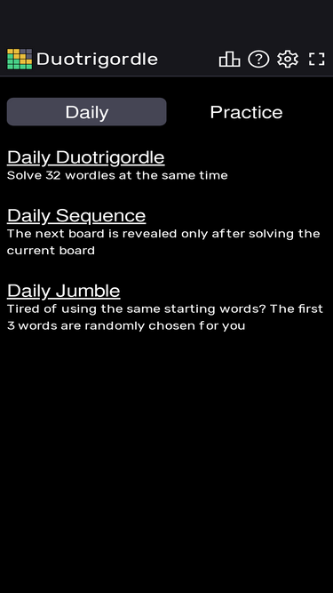 82%put your skills to the test and solve thirty-two wordles at once! you have 37 guesses to solve all 32 words. a new duotrigordle available each day to solve.