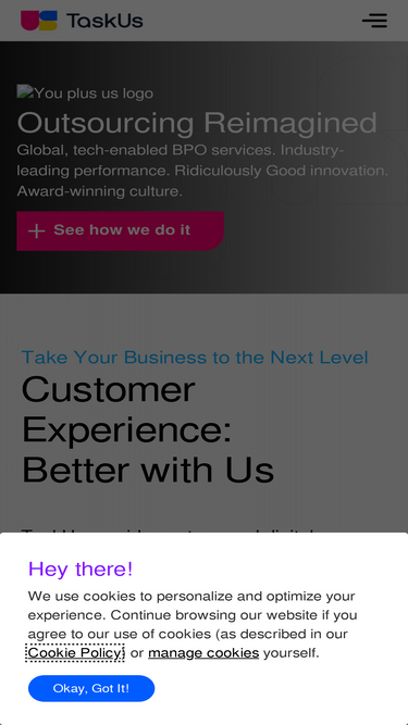 96%TaskUs, a digital solutions provider, combines expert teammates and cutting-edge technology to solve customer challenges, protect users, and drive growth.