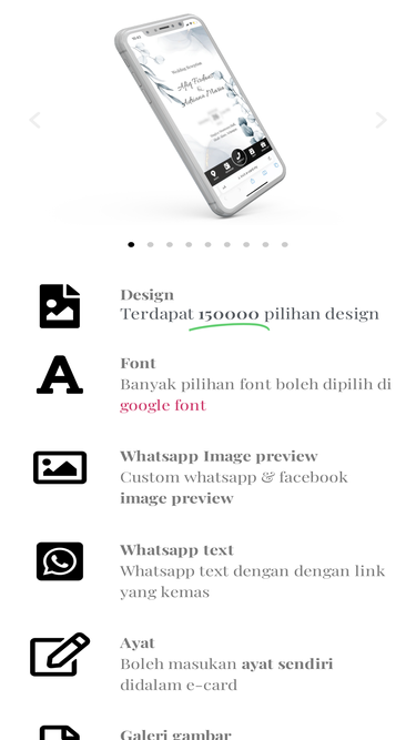 92%Design Terdapat 150000 pilihan design FontBanyak pilihan font boleh dipilih di google font Whatsapp Image previewCustom whatsapp & facebook image preview Whatsapp textWhatsapp text dengan dengan link yang kemas AyatBoleh masukan ayat sendiri didalam e-card Galeri gambarSlide show gambar anda dan pasangan CountdownCountdown timer untuk tempoh mengisi borang RSVP & tarikh majlis GreetingsBorang ringkas untuk […]