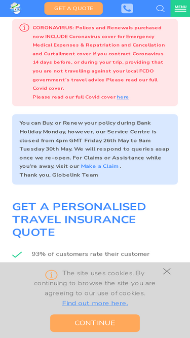100%globelink travel insurance for uk, eu & eea residents up to 89 yrs old. from £21.47. low excess levels. trusted since 1996. easy quote process. quote now!