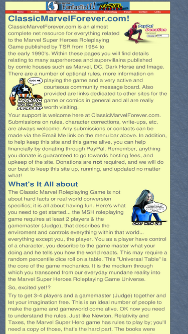 100%an almost-complete msh rpg resource, containing a plethora of gaming material for a classic marvel campaign, including a heap of character profiles, custom rules, a lively message board, links, and much, much more.