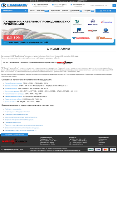 87%организация ооо "снабкабель" зарегистрирована в городе чебоксары (республика чувашия) 20 сентября 2000 года. компания специализируется на поставках исключительно кабельно-проводниковой продукции (кпп). с 2006 года являемся дилерами завода ао "чувашкабель".