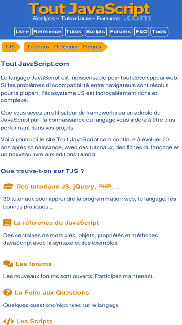 88%des tutoriaux pour apprendre le javascript, ajax, jquery et le php | toutes les syntaxes dans la référence du langage javascript | des forums pour discuter entre devs.