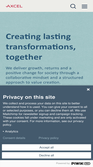 Founded in the Nordics, Axcel is a leading private equity firm investing across Northern Europe, with a focus on four sectors: Technology, Business Services & Industrials, Healthcare and Consumer.
