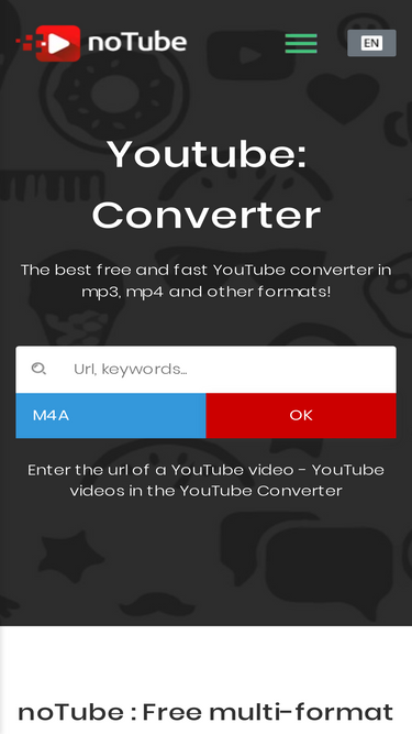 100%noTube, N ° 1 YouTube dönüştürücüdür. YouTube mp3 ve mp4 reklamsız, hızlı, ücretsiz. İster YouTube videolarından ister başka bir videodan videolarınızı, Playlist MP3, veya YouTube Short MP4'e indirin ve dönüştürün Converter.