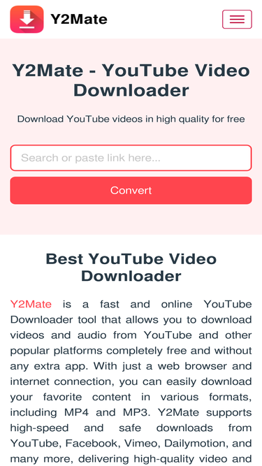 Y2Mate è un downloader di video YouTube gratuito che ti permette di convertire e scaricare video di YouTube in formato MP3 e MP4 in qualità HD. Non richiede alcuna app.