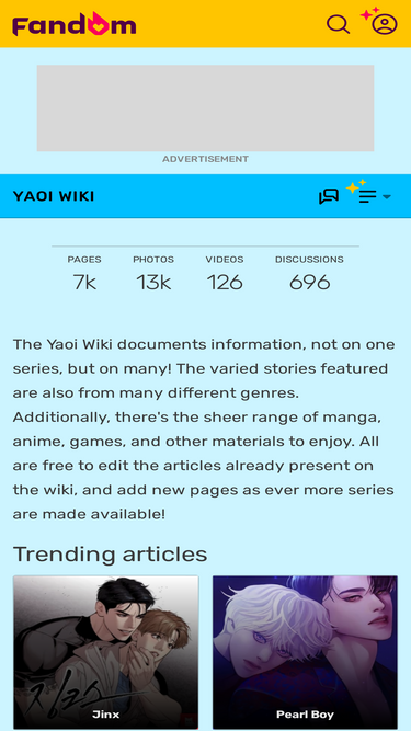 82%The Yaoi Wiki documents information, not on one series, but on many! The varied stories featured are also from many different genres. Additionally, there's the sheer range of manga, anime, games, and other materials to enjoy. All are free to edit the articles already present on the wiki, and add new pages as ever more series are made available!